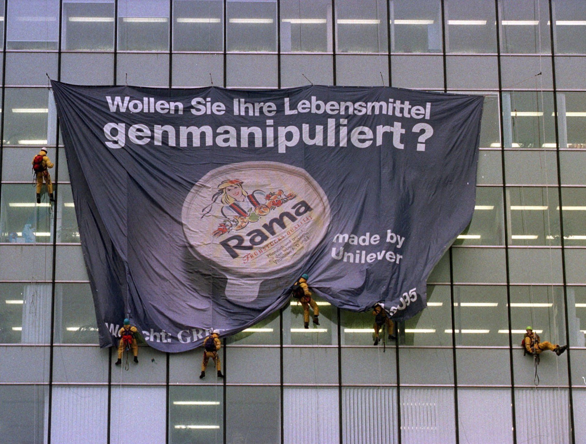 Greenpeace-Aktivisten vor der Unilever Zentrale in Hamburg. Sitz der Union Deutsche Lebensmittelwerke GmbH (UL), eine Tochtergesellschaft von Unilever. Die UL verarbeitet vor allem pflanzliche Öle, Produktion von Margarinen.