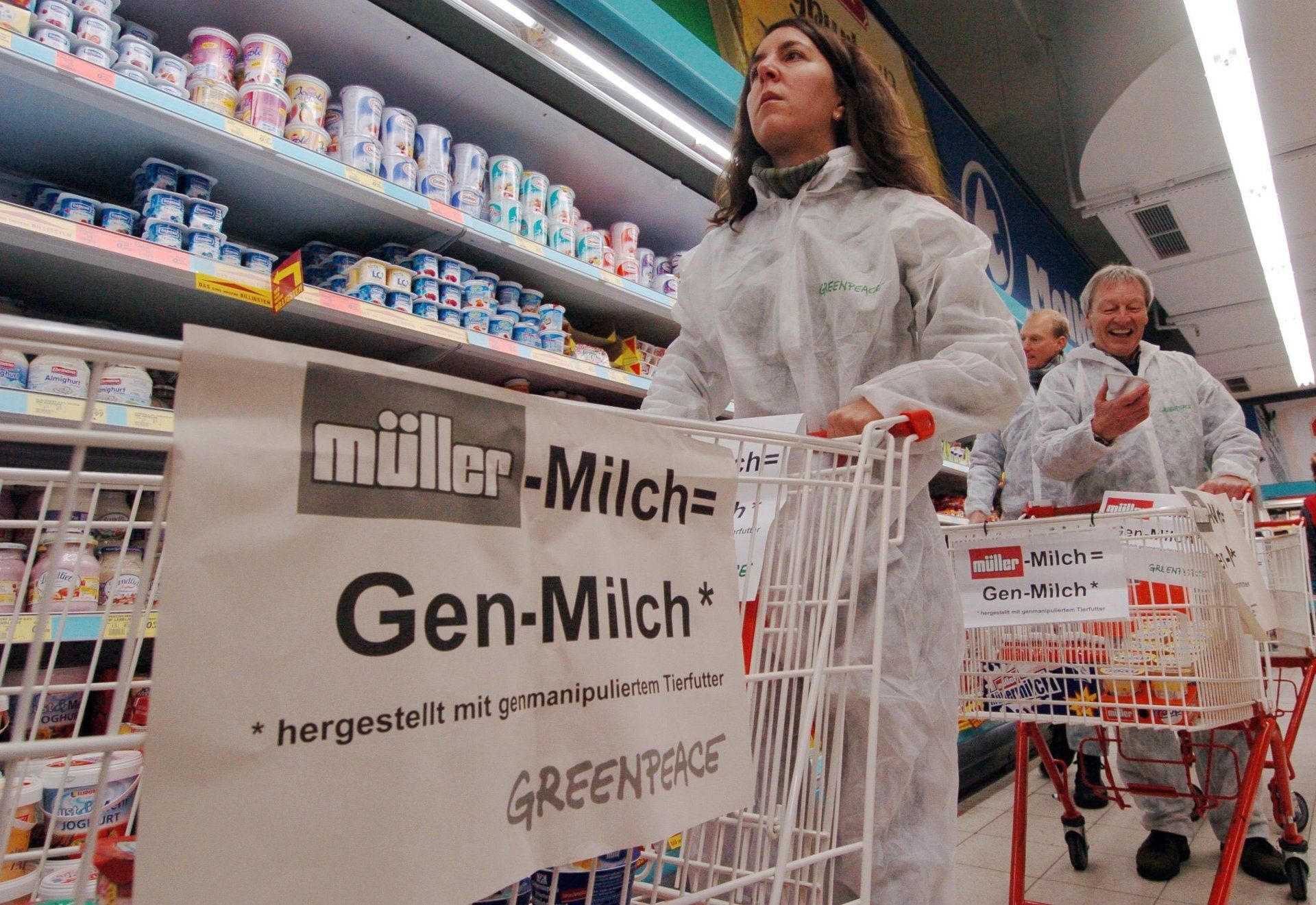Im Frühjahr 2004 weigerte sich die Unternehmensgruppe Müller-Milch (Theo Müller GmbH & Co) trotz mehrmaliger Aufforderungen den detaillierten Abfragen von Greenpeace zum Einkaufsberater „Gentechnik im Essen“ nachzukommen. Stattdessen antwortete sie: „Die Unternehmensgruppe habe alles in ihrem Einflussbereich Mögliche getan, um den Einsatz von gentechnisch veränderten (GVO) Tierfutter auszuschließen.“ Dies war offensichtlich zu wenig. Greenpeace schaltete daraufhin die Satire-Kampagne „Müll-Milch“ (www.müll-milch.de), gegen die dann der Unternehmer Müller gerichtlich vorging. Dies war zu viel! Der Unternehmer gab nicht klein bei; er brach die goldene Regel „Lege dich niemals mit Greenpeace an“ Greenpeace kämpfte daher mit härteren Bandagen an. Greenpeace-Aktivisten blockierten Zufahrtswege zu Müller-Milch Molkereien, Fabrikgebäude wurden mit Aufschriften wie Müller-Milch = Gen-Milch oder Müller-Milch igitt igitt angestrahlt. Informationskampagnen über die Gefährlichkeit von gv-Pflanzen und die unvorhersehbaren Risiken durch ihre Fütterung für Tier und Mensch wurden durchgeführt. ► Ihr Fazit war stets: „Eine Molkerei wie Weihenstephan (Anmerkung: die Molkerei zu Müller-Milch), die Genfutter bei ihren Lieferanten duldet, nimmt solche Nebenwirkungen auf Mensch und Natur billigend in Kauf. Gleichzeitig scheint sie an möglichen Nebenwirkungen des Einsatzes genmanipulierter Pflanzen im Tierfutter auf unsere Gesundheit kein Interesse zu haben – ebenso wie sie gerne Verbraucherwünsche ignoriert.“ Kampagnen dieser Art sind allerdings nicht sehr öffentlichkeitswirksam. Deshalb befreien Greenpeace-Aktivisten (Februar 2005) Geschäfte in Freising von den risikobehaften Milchprodukten - Gen-Milch bis zum Gen-Joghurt - und verbringen sie zurück zur Molkerei in Weihenstephan. Im März 2005 demonstrieren Greenpeace-Aktivisten in München sowie in weiteren 30 Städten vor Supermärkten gegen den Einsatz von genmanipulierten Futtermitteln bei der Molkerei Weihenstephan, die zur Firmengruppe Müller-Milch gehört. Später stürmen in 50 Städten Greenpeace-Aktivisten Supermärkte und versehen die Müller-Milch Produkte mit Warnaufklebern „Gen-Milch: Hände Weg!“. ► Greenpeace erklärt dazu: „Müller glaubt, Gen-Soja verfüttern zu können, nur weil die Milch nicht gekennzeichnet werden muss. Verbraucher können nicht erkennen, dass bei Müller Gen-Milch im Becher ist. Dies wollen wir mit unserer Aktion ändern. Heute kann der Verbraucher wählen, ob er Gen-Food kauft oder nicht.“ In wieweit und welche Umsatzverluste die Unternehmensgruppe durch die Aktionen erlitten hat, ist nicht bekannt geworden, aber der Unternehmer Theo Müller wehrt sich. Er unternimmt einen Gegenangriff. Er überzieht Greenpeace mit Prozessen: ► „Wir werden Greenpeace auf Schadenersatz verklagen, Anzeigen wegen Hausfriedensbruch, Nötigung, übler Nachrede und Verstöße gegen das Versammlungsverbot erstatten.“ Ebenso versucht der Unternehmer die Gemeinnützigkeit von Greenpeace in Frage zu stellen. Eine solche Gegenwehr, und dies aus dem Ernährungsbereich, ist für Greenpeace ungewohnt und nicht hinnehmbar. Langjährige Prozesse werden ausgetragen. Die Zulässigkeit des Begriffes „Gen-Milch“ wurde letztlich vom Bundesgerichtshof entschieden. Bundesgerichtshof: „Der Gebrauch des Begriffs „Gen-Milch“ durch den Beklagten genieße aber den Schutz des Grundrechts auf Meinungsfreiheit“ (► BGH-Urteil von 11. März 2008). Eine Verfassungsbeschwerde gegen das Urteil wurde abgewiesen. In der Öffentlichkeit wurde das Urteil als großer Erfolg von Greenpeace über Müller-Milch gefeiert. Verschwiegen wurde allerdings, dass alle Aktionen von Greenpeace in Bezug auf Müller-Milch keinerlei Auswirkungen hatten und die Blockierungen der Zufahrtswege und das Bekleben der Müller-Milch Produkte mit Warnhinweisen rechtlich nicht zulässig waren. Aber erneut gab es für beide Seiten eine win-win Situation: Greenpeace hat sein Gesicht gewahrt und darf weiter den Begriff „Gen-Milch“ nutzen; Müller-Milch wurde später nicht mehr in Sachen Gentechnik von Greenpeace angegriffen.